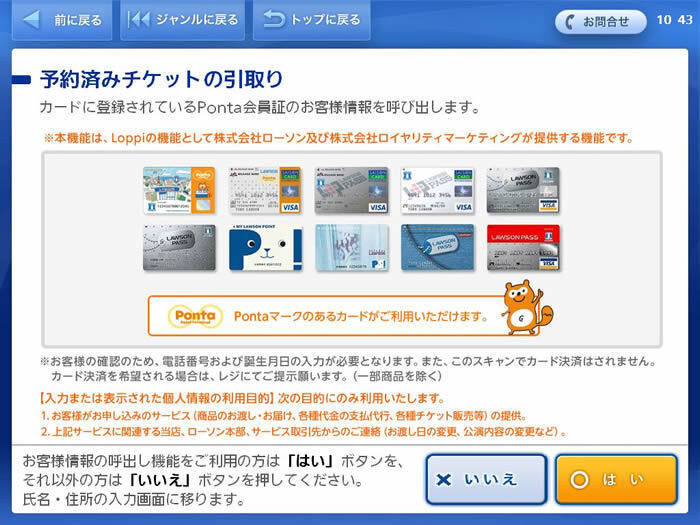 6. Ponta 카드가 있는 경우 오른쪽의 はい(예)를, 없는 경우에는 いいえ(아니요)를 터치 (필자는 Ponta 카드가 없어 아니요를 터치했다.)